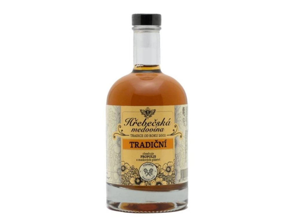 Hřebečská medovina tradiční, je nejčistší podoba medoviny vyrobená z medových pláství a obsahem propolisu. Neobsahuje žádné další bylinky nebo koření. Má velmi jemnou vůni po medu, její chuť je velmi rovněž jemná až panensky čistá v závěru chutě doznívají krásné tony po včelách plástvech.